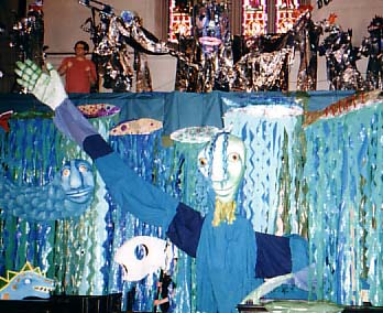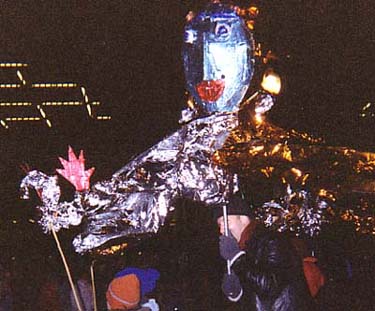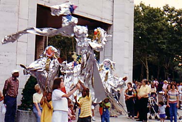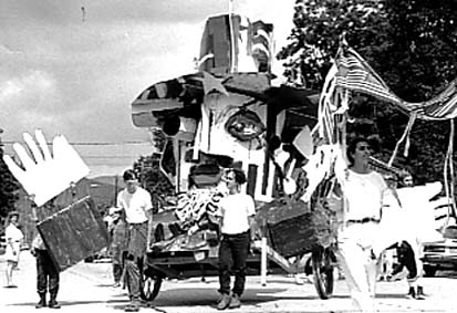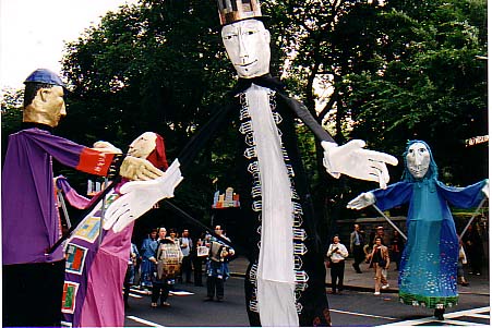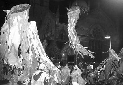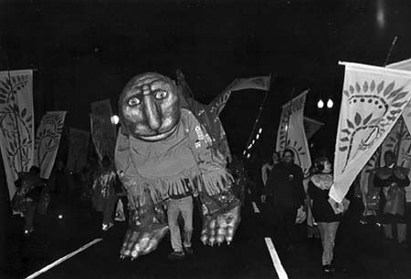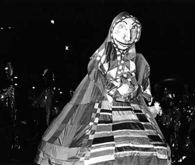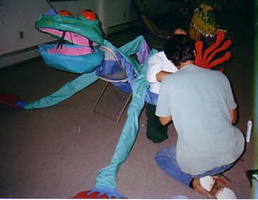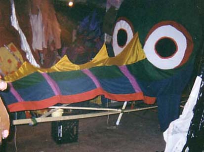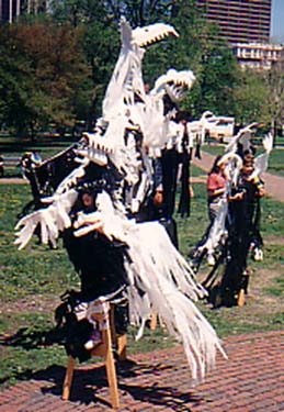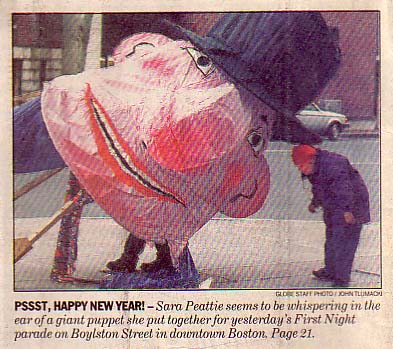 It sort of…morphed. I came here and I started working also with another group – Back Alley Puppet Theater – and the Northeast Kingdom Puppet Theater, who had taken over from Black Wheat Puppet Theater, who were here, but were not the original puppeteers who were here, and then they changed names and morphed and sort of left and Back Alley sort of…became entangled with Puppet Co-op – Back Alley doing Boston stuff and building stuff much quieter, more respectable, and Puppeteers Co-op doing workshops around the country and doing big parades. A much more loud and traveling group of people. We were working a lot with First Night, which at the time was expanding madly, and we were doing First Nights all around the country, and they all had puppets and parades.