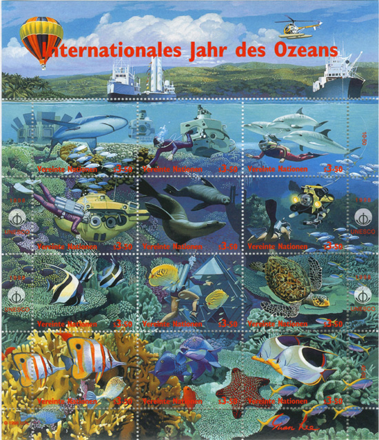 This is something I did for the United Nations for the 1997 or 1998 International Year of the ocean. This one was issued in Vienna, that's why it's in German. You see, that's my signature. The UN put it there. I never asked. Because my stamps are very collectible, they even asked my permission to put my signature there.